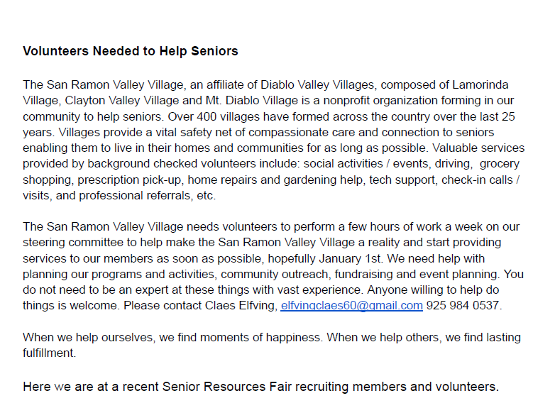Would you like to volunteer by being a member of our steering committee and making the San Ramon Valley Village a reality?